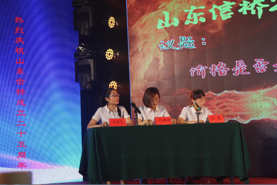第五個(gè)節(jié)目是由信橋男生隊(duì)王丙丙、高雨、郭帥,女生隊(duì)徐賽、劉琳琳、宋金萍,客串周廣超、趙文玲帶來的《辯論賽》,辯論主題是價(jià)格是否是決定銷量的關(guān)鍵因素,雙方辯手就自己的觀點(diǎn)展開了激烈的討論,最后全體辯手共同朗誦《沁園春·信橋》。