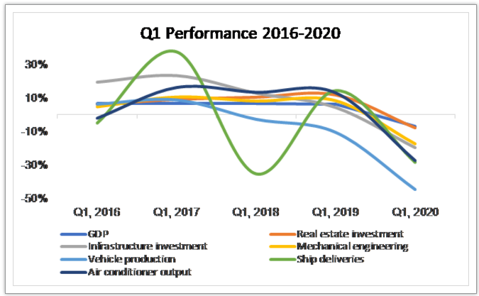 其中包括:GDP下降6.8%,房地產(chǎn)投資下降7.7%,基建投資下降19.7%,通用機(jī)械下降17.2%,汽車產(chǎn)量下降44.6%,船舶交貨量下降28.5%,空調(diào)產(chǎn)量下降27.5%。