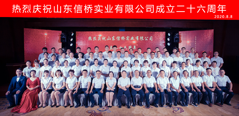 2020年8月8日,山東信橋?qū)崢I(yè)有限公司二十六周年慶典在泰安帝苑酒店隆重舉行。各路榜樣精英、以及二十六年來給予信橋厚愛的各級領(lǐng)導(dǎo)、各位同仁、新老朋友在這里歡聚一堂,與為公司付出辛勤勞動的全體員工一起,分享屬于大家的光榮與快樂!